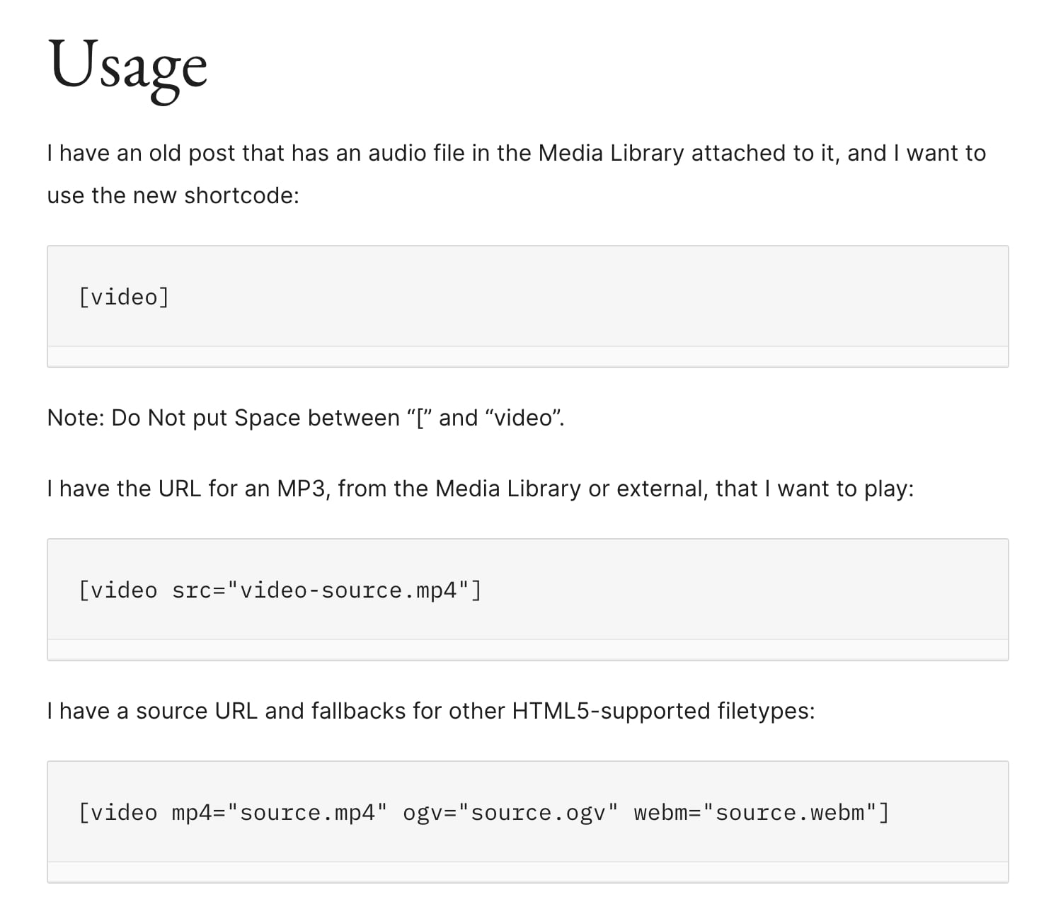 The Video feature allows you to embed video files and play them back using a simple shortcode.